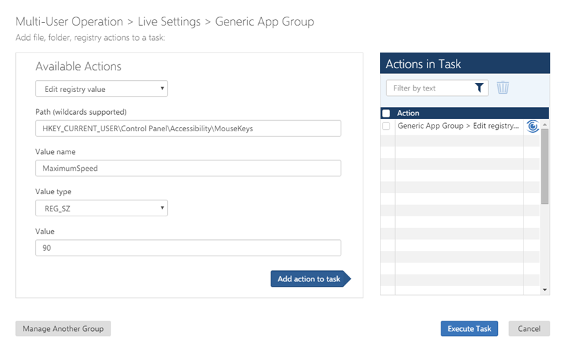 Create a custom task to change a registry value in the settings for Windows Settings Groups or an Application Group. You can combine multiple file, folder, and registry actions in a single custom task.