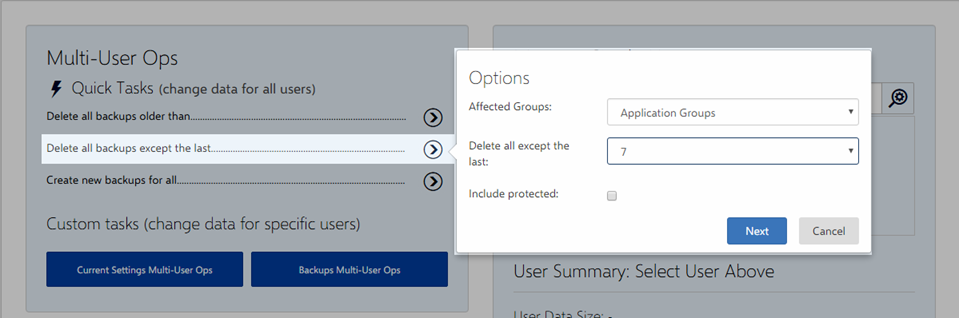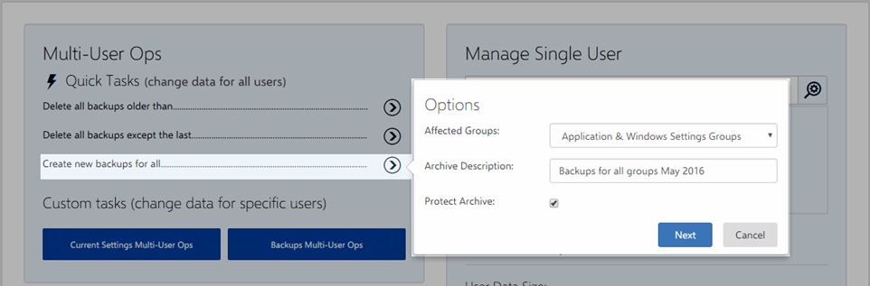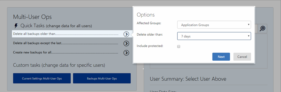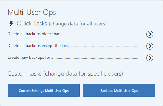 Administrators and Primary Administrators can perform data operations for multiple users at a time. You can choose "quick" tasks - which are common data operations executed in a few clicks - or custom tasks, which can include manually editing specific settings. The tasks can be executed immediately or you can defer them. Multi-user operations are performed in the background and you can manage them in the task manager panel.