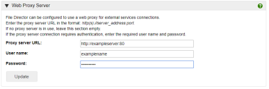 File Director can be configured to use a web proxy for external services connections such as OneDrive, Google Drive and Box for example. If your proxy service requires a trusted root certificate, this can be installed from the SSL certificates screen. Refer to the Trusted Root Certificate Authorities.