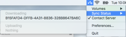 The Status menu displays which file is currently and whether it is uploading or downloading. Click the filename to go to the file in Finder.