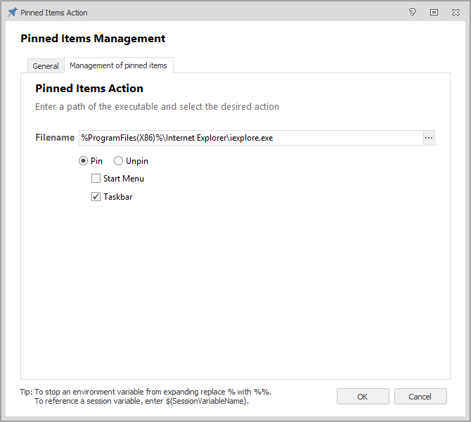 Épinglez ou retirez des applications dans le menu Démarrer ou la barre de tâches Windows sur les postes client gérés. L'action compare les éléments épinglés existants du poste client à ceux que l'action est configurée pour épingler.