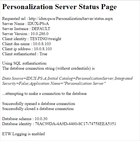 - http://<SERVEUR>/PersonalizationServer/dbmonitor.aspx - Vérifie la connexion à la base de données. Renvoie « OK » si la base de données est accessible et « FAIL » si elle ne l'est pas.