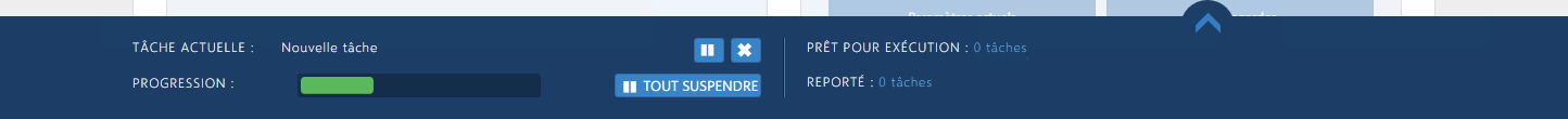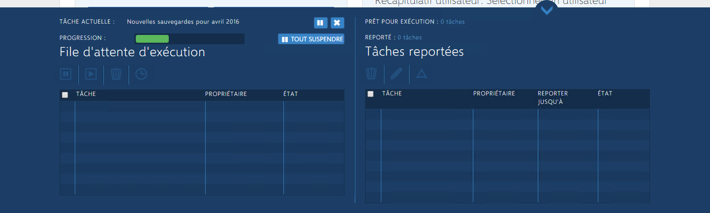 Les administrateurs et les administrateurs maîtres peuvent gérer la file d'attente des tâches dans l'outil Gestionnaire de tâches, volet coulissant au bas de la console. L'outil Gestionnaire de tâches est disponible dans chaque page de la console. Lorsqu'il est réduit, ce volet affiche la description de la tâche actuelle, une barre de progression, et des options permettant de suspendre ou d'annuler la tâche. Il indique également le nombre de tâches prêtes à l'exécution et le nombre de tâches reportées.