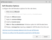 昇格された後、アプリケーションが実行される方法を指定して、ルール項目の自己昇格オプションを構成します。昇格が子プロセスまたは共通ダイアログに影響する方法を定義できます。
