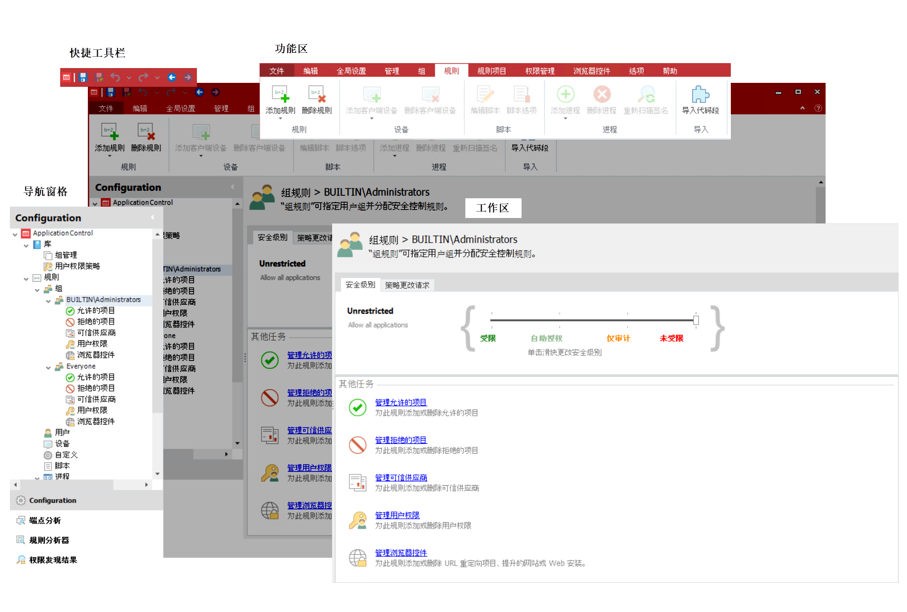 控制台允许您为 Application Control 创建、查看、编辑和保存配置。控制台包括配置探查器,可使用此探查器查看配置对用户的可能影响。规则分析器功能允许您在安装并运行 Application Control 代理的端点上记录配置对用户的实际影响。端点分析工具允许您记录应用程序使用情况,并在安装了 Application Control 代理的端点上编目已安装的应用程序使用情况。