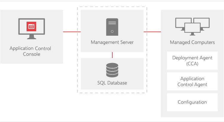 配置本地存储在“所有用户”配置文件中,受 NTFS 安全功能保护。在独立模式下,配置更改会从 Application Control 控制台直接写入文件系统。在企业模式下,配置存储在 Management Center 数据库中并使用 Management Center 控制台以 MSI 格式分发。