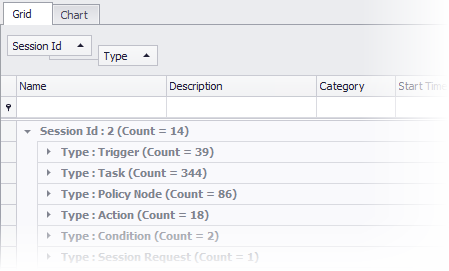 网格视图提供对活动的分析。每行代表一个事件,例如一个操作或一个条件。