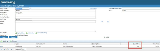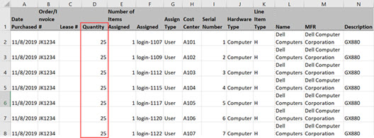 - Quantity: The total line items for each entry. If your imported data has multiple entries for the same line item in your spreadsheet, then the Quantity in this field should reflect the total line items for each entry. Example: If you have a line item with 25 computers and your spreadsheet has 25 entries for each assignment, the Quantity should be 25 on each entry in the spreadsheet.
