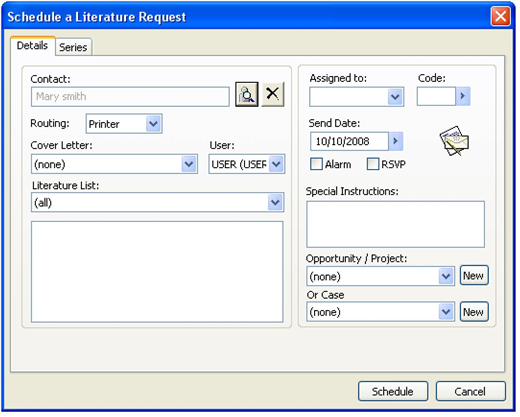 Click Schedule to complete the process, or select the Series tab to assign the literature request to a group of contacts. |