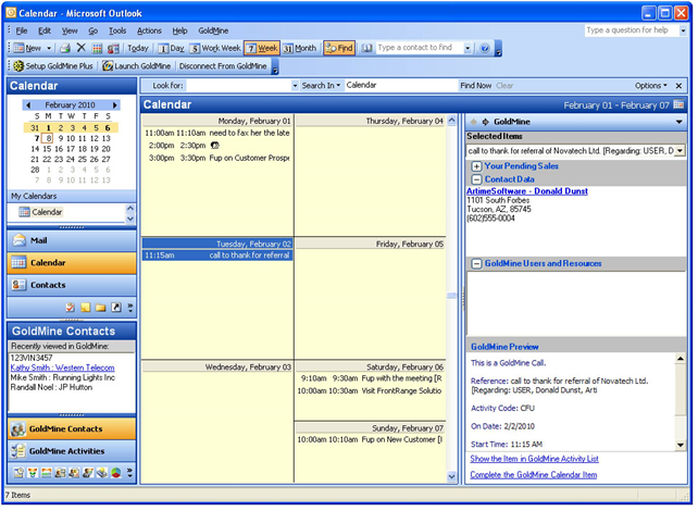 It the following example, a selected GoldMine task to make a call is selected in the Outlook Calendar. The GoldMine Outlook Panel displays the details for the call to the right of the Calendar.