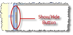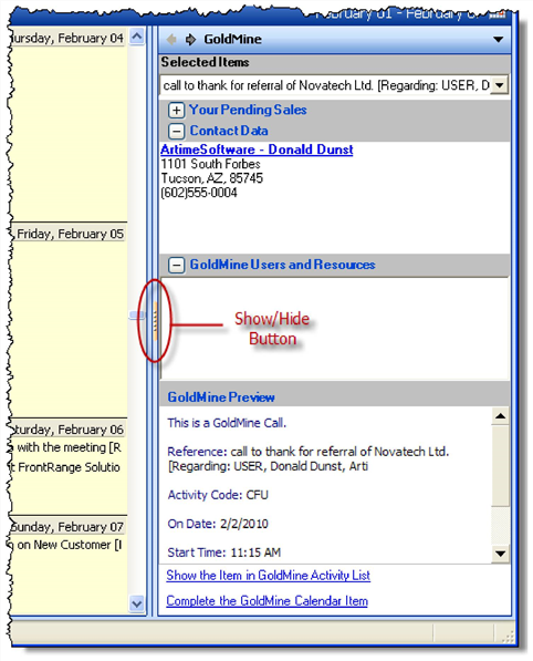 The Show/Hide button for the GoldMine Outlook Panel is located in the center of the vertical bar separating the Outlook Calendar and the Outlook GoldMine Panel. This procedure is similar to hiding/showing the GoldMine Outlook Navigation Pane (see To Hide/Show the GoldMine Outlook Navigation Buttons), but this procedure hides the GoldMine Panel located on the right portion of the Outlook window.