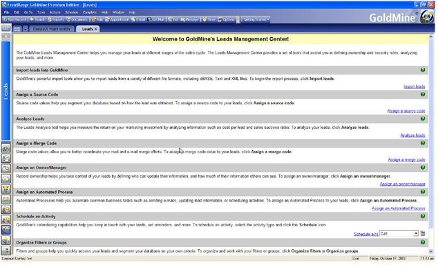 The Center provides a sequence of activities to help manage marketing activities related to the base of contacts and potential leads. Identify and track who brings in the lead, who and how contact is made, and the lead's progress through the sales cycle.