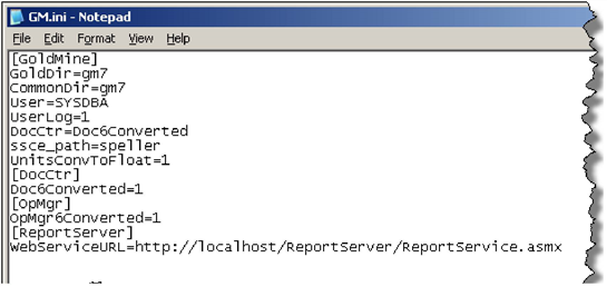After installing Microsoft SQL Server Reporting Services and configured on the network, add a section to the gm.ini file typically located in Program Files/GoldMine/. This tells GoldMine where the Reporting Services is hosted.