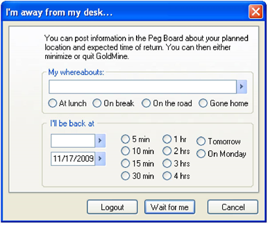 ○ Wait for me.This option minimizes GoldMine. Although you are not logged out of GoldMine, you are prompted for your password to restore the display. After returning to your work session, GoldMine automatically clears the reference in the Whereabouts column of the Peg Board.
