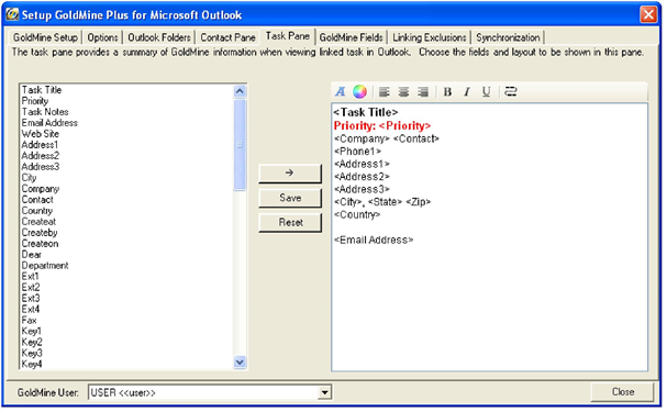 When a task is linked to a GoldMine task, the GoldMine Panel is populated with Task Information and Items for the linked task. You can select what information and how it is displayed by modifying the Task information display.