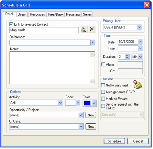 You will notice that when you select an activity, the Schedule dialog box reflects that activity. If you schedule a call, the Schedule dialog box title is Schedule a Call. If you are schedule a next action, the Schedule dialog box title is Schedule a Next Action