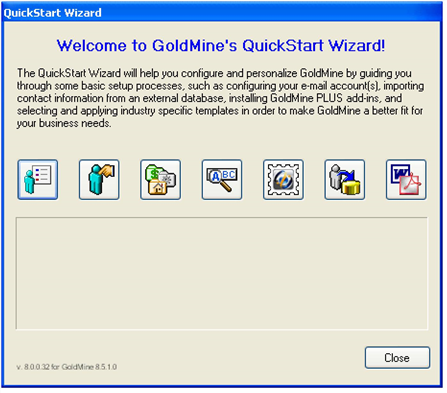 The QuickStart Wizard allows you to access and configure basic operations and tools to work with GoldMine.