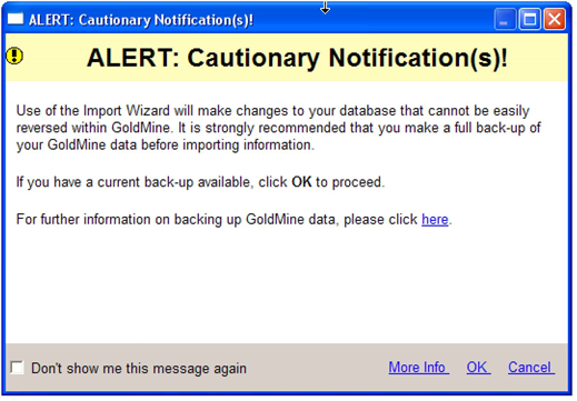 | 2. | At the GoldMine QuickStart Wizard dialog box, click the Data Import Wizard button. |