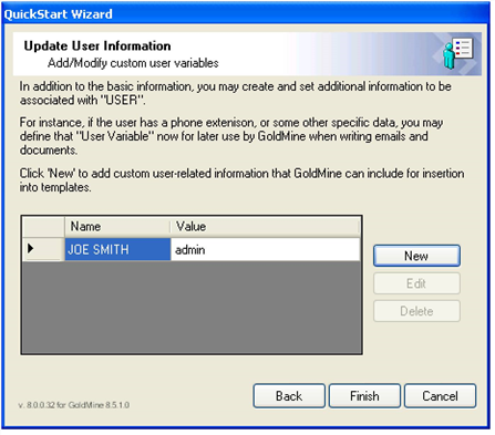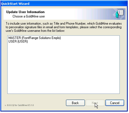 | 2. | At the GoldMine QuickStart Wizard dialog box, click the User Information Wizard button. |