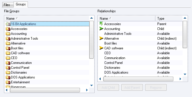 The file group 16 Bit Applications is the parent of Accessories, and also has indirect child Alternative and CAD software: