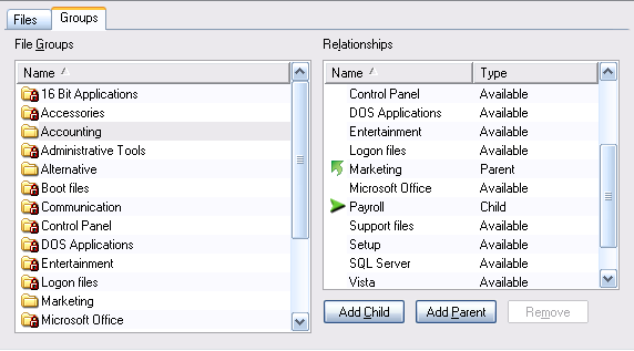 You administer parent-child relationships between file groups using the Database Explorer Groups tab.