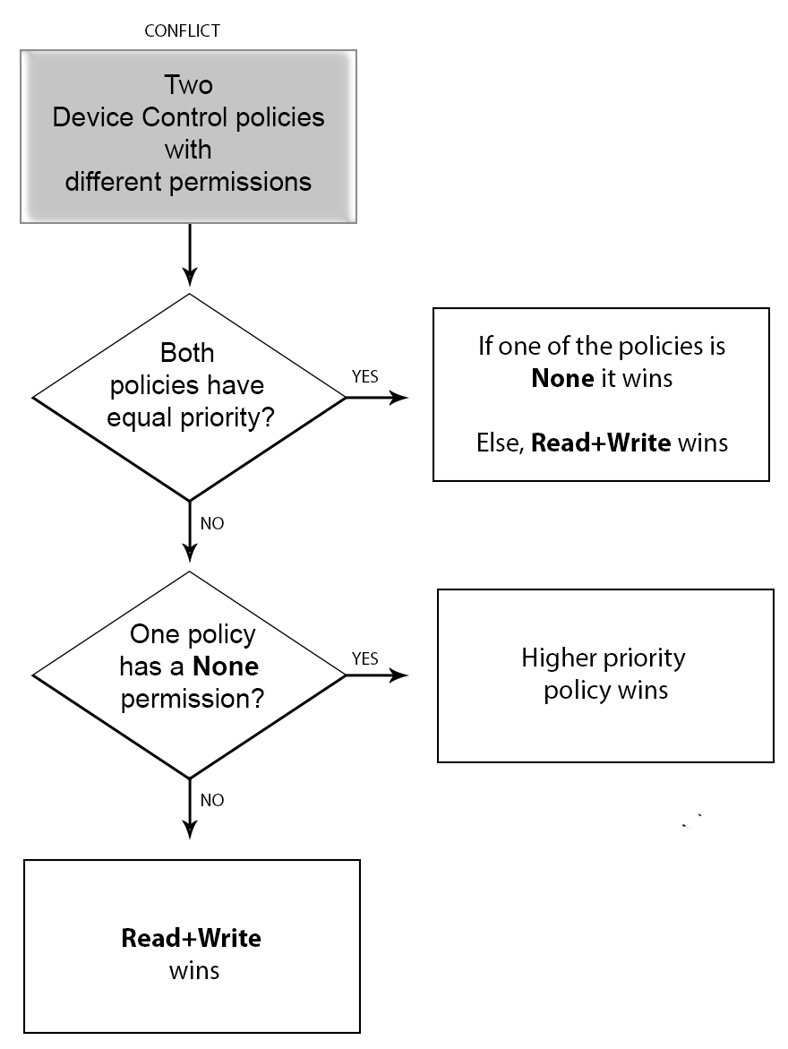 The following diagram can be used to determine the resultant policy permission when two policies that contain different permissions merge: