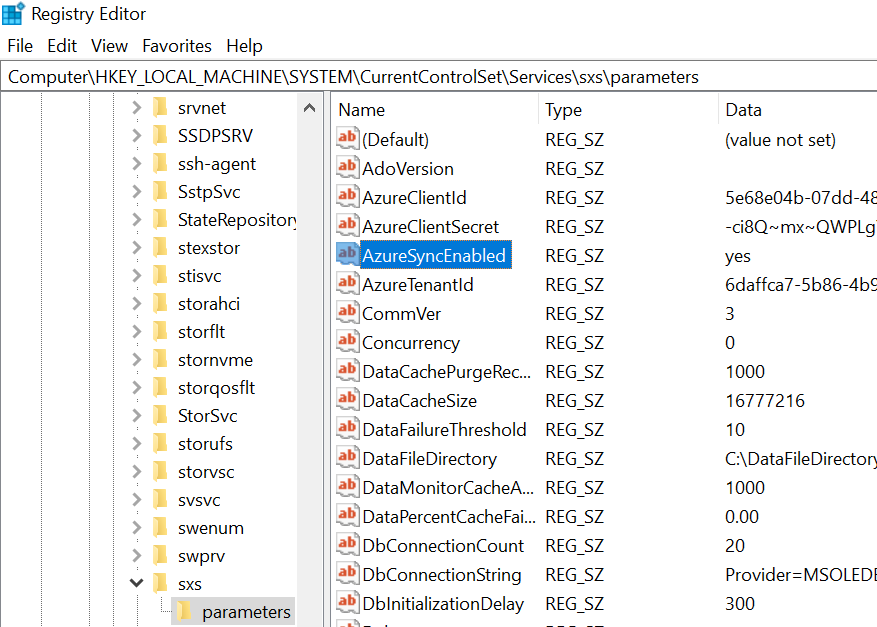To enable the Azure Domain Synchronization functionality, set the registry key value to yes for the AzureSyncEnabled parameter in the SXS registry key at the following location: