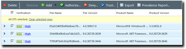 To generate an application prevalence report, the Application Library list must be displaying one or more files (not applications). If the list is not displaying files, the Prevalence Report button is disabled.