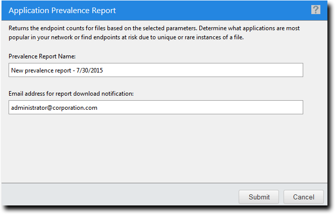 Application Library allows you to generate an application prevalence report which returns a list of specified files and the number of endpoints that each file was detected on.