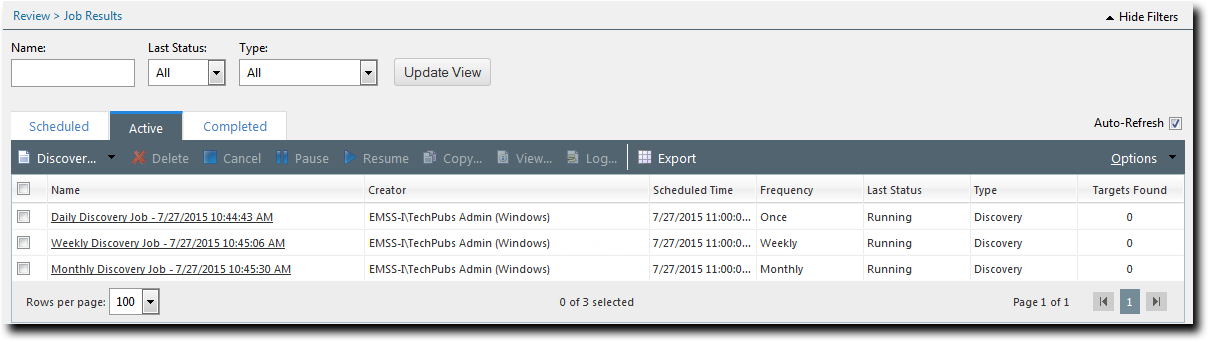 This tab lists Discovery Scan Jobs and Agent Management Jobs that are in progress. View this tab to see job results in real time.