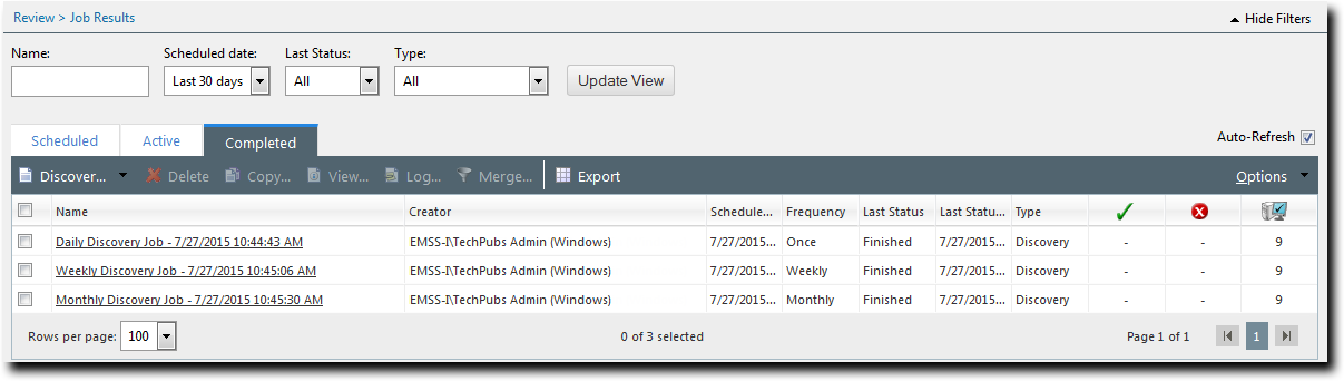 This tab lists Discovery Scan Jobs and Agent Management Jobs that are completed or canceled, as well as their configuration details.