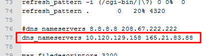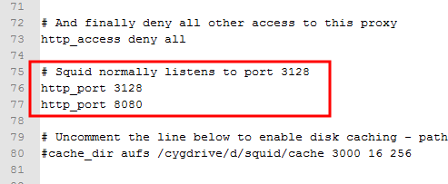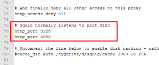 Under # Squid normally listens to port 3128, add http_port 8080 directly below http_port 3128. 8080 is a listener port commonly used by proxy servers.
