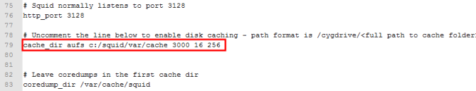 Uncomment (remove the #) from the line #cache_dir aufs/cygdrive/d/squid/cache 3000 16 256 and change the path to point to the cache folder (c:/squid/var/cache). This enables disk caching, reducing the network load for low-bandwidth remote locations.