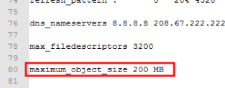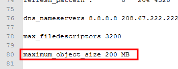 At the very bottom of the file, add and set the maximum_object_size parameter. Without it, Squid, by default, will only cache files up to 4 MB in size.