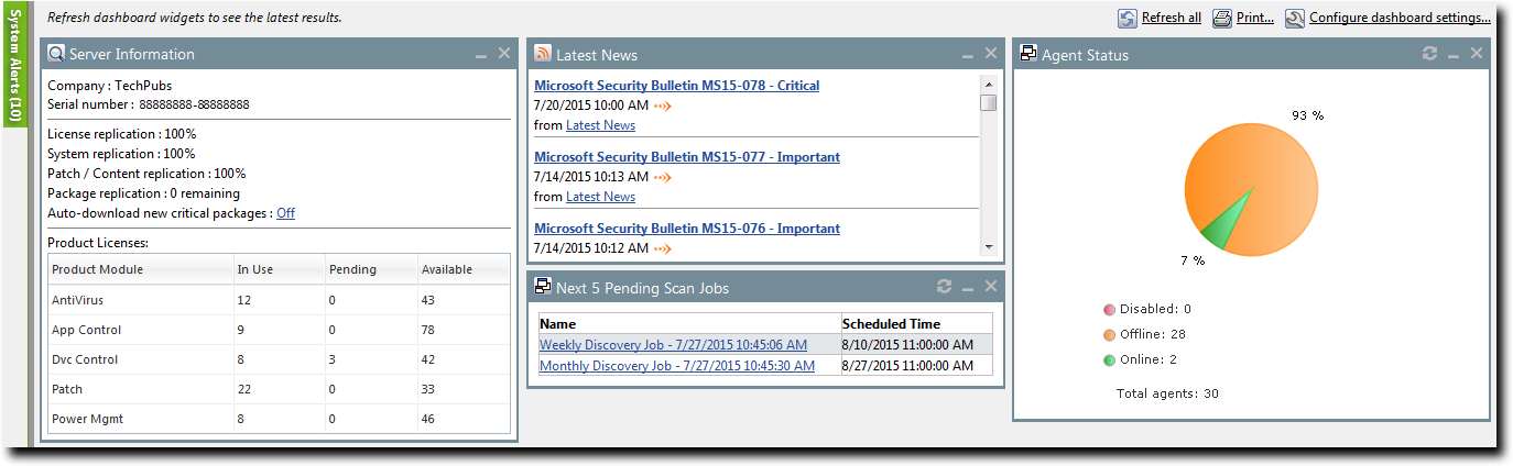 Some widgets display general information about the system, others provide links to documentation, and still others summarize activity for Ivanti Endpoint Security modules you are licensed for.![]()