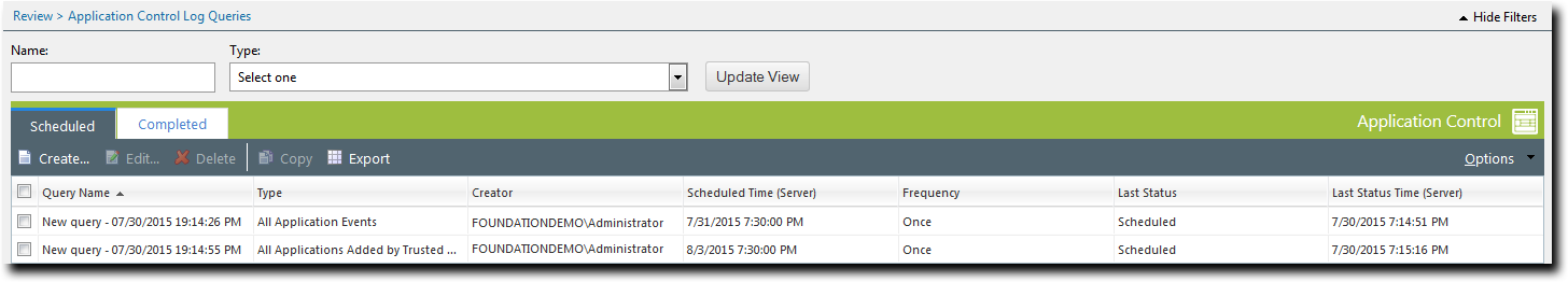 You have created a new Application Control Log Query based on a Completed query and executed it. If not run immediately, it will appear under the Scheduled tab on the Application Control Log Queries page.