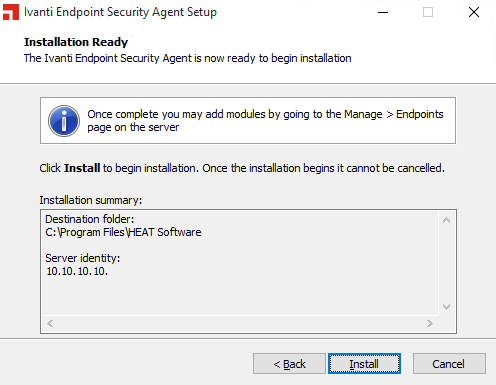 - Ivanti Endpoint Security is installed and initial replication has been completed. For details regarding installing Ivanti Endpoint Security, refer to the Ivanti Endpoint Security: Server Installation Guide.