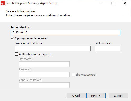 - [Optional] If the agent will communicate with the Ivanti Endpoint Security server through a proxy server, select the A proxy server is required check box and complete the following steps.