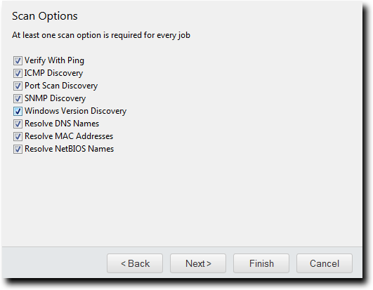 Jobs using this option request a series of echoes, information, and address masks from endpoints. Endpoint responses are then compared to a list of known ICMP fingerprints to identify endpoint operating systems. ICMP Discovery is ineffective on endpoints configured to ignore ICMP requests. For best results identifying Windows operating systems, use this option in conjunction with Windows Version Discovery. |