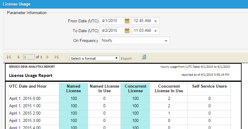 2.Select the License Usage report. The report appears in a new window showing the data from the time the report was last run.
