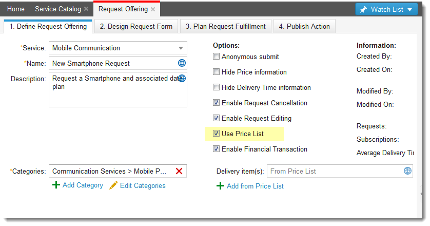 Notice that Use Price List is enabled. (See Creating a Request Offering.)