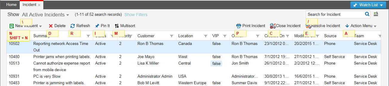 When you are in a read-only control where you cannot enter any text, such as the child panel below, you do not need to use a modifier. You can just click the keyboard shortcut without the modifier and achieve the same result.  For example, below, if you click N in the incident list, the application displays the New Incident window. If you click Alt+N, the application also opens the New Incident window.