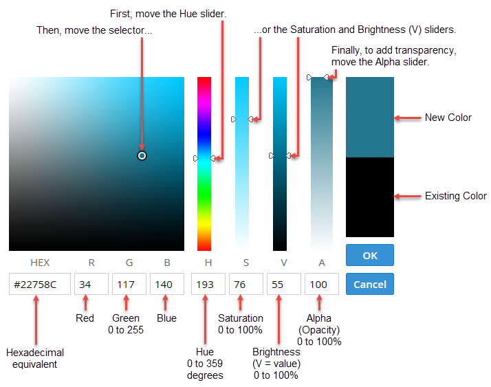 The color picker includes an alpha channel, which enables you to blend two colors. The word transparency is traditionally associated with the function of the alpha channel. But in Neurons for ITSM, it might be easier to use the word opacity, since the numbers on the alpha scale correspond to percentage of opacity.