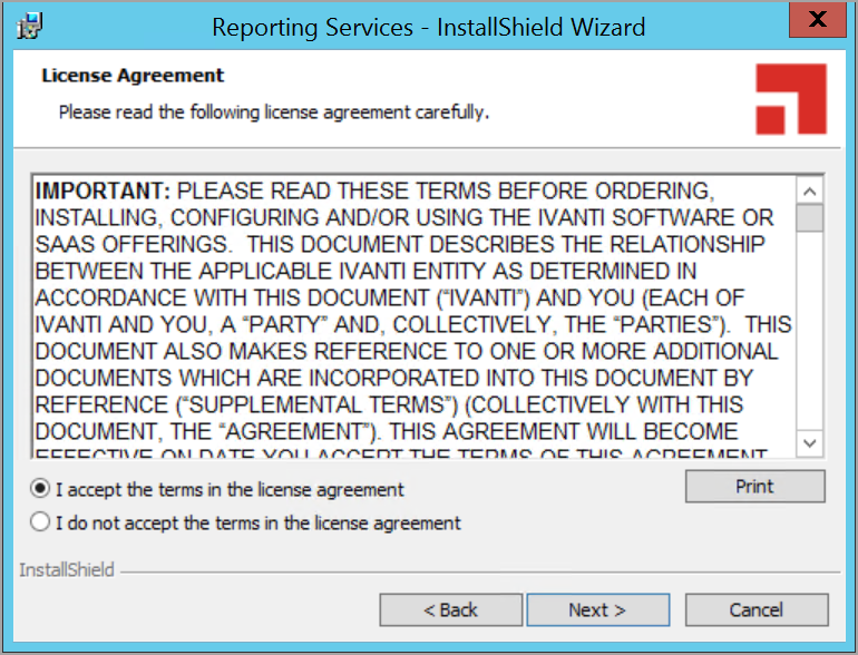 10.Click Next. The system displays the Ivanti Reporting Service Configuration page. See Configuring the Reporting Feature. (If the system displays the Backup Encryption Key dialog box, see step 5.)