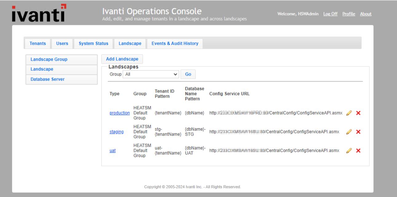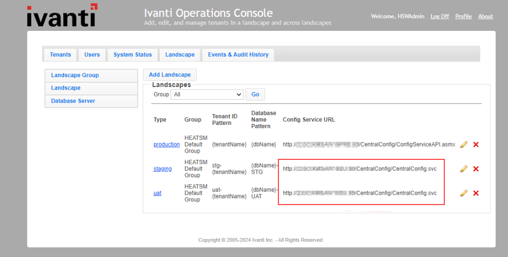 3.Check the landscape configuration from the DB or through ops console. If it is similar as shown the image below, that is if it has - /ConfigServiceAPI.asmx at the end, update those specific landscapes to have /Centralconfig/CentralConfig.svc route instead.