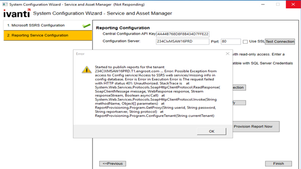 Check if the SSRS report configuration is reachable. After confirming, restart the SCW configuration.