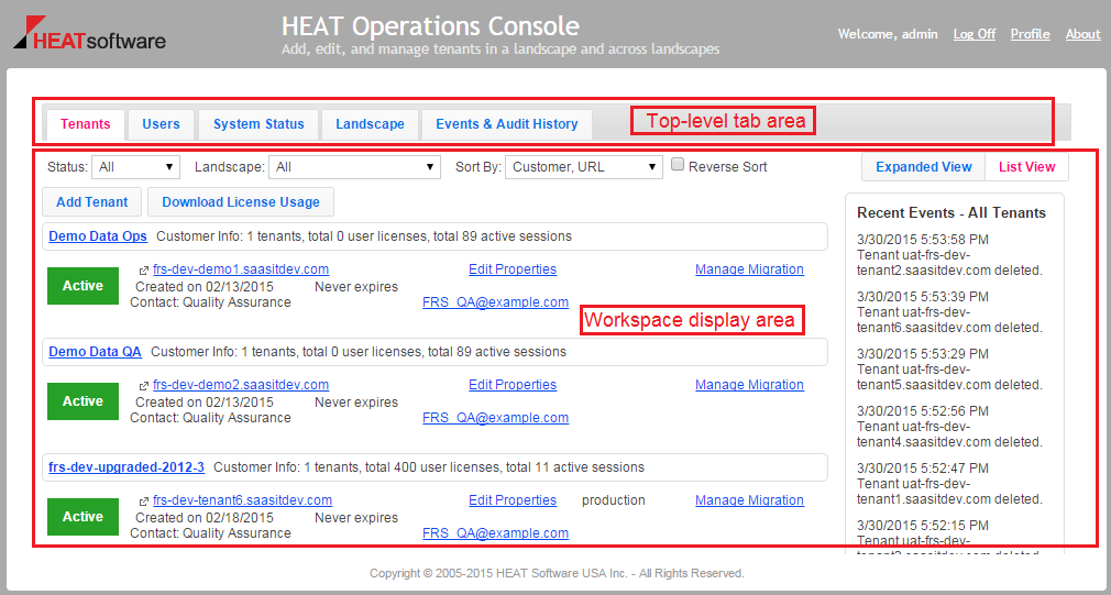 The Operations Console, shown in Operations Console Main View (Tenants Workspace Displayed), contains these areas: