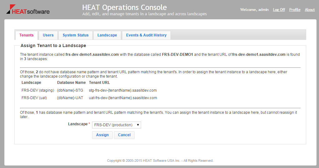 If the tenant instance is not assigned to a landscape, the system prompts you to assign the tenant instance to a landscape to prepare it for migration. See Assigning a Tenant to a Landscape. (If you do not see this screen, your tenant instance is ready for migration. Go to step 5.)