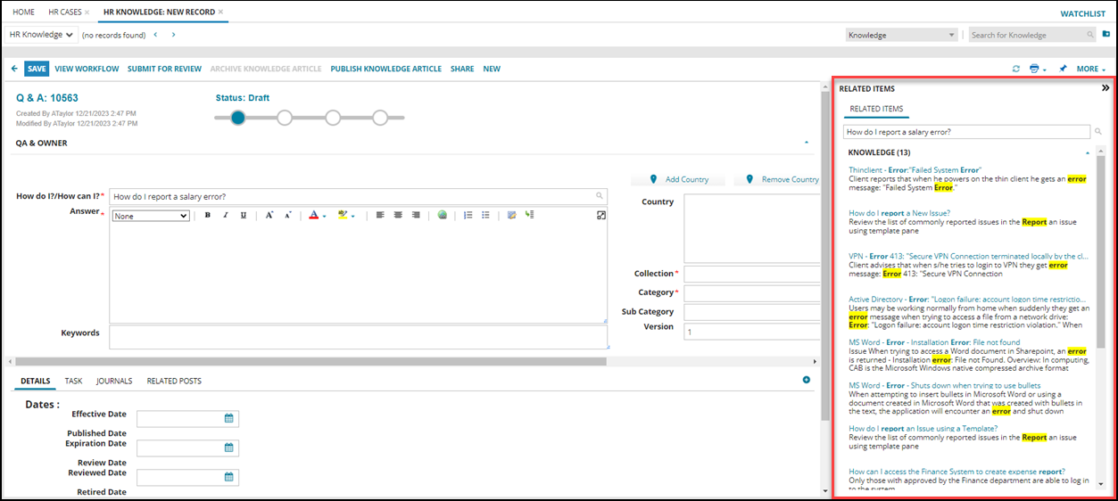 When you start typing in the Title or How can I fields, the Related Items pane appears showing any related Knowledge Articles. By looking at the existing articles, you can avoid duplication. You can also access information to help you to create the most accurate document.