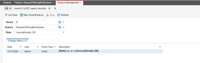 •In ConfigDB, go to Feature Management > RequestOfferingBulkUpload, and select the UnconditionallyOn checkbox.